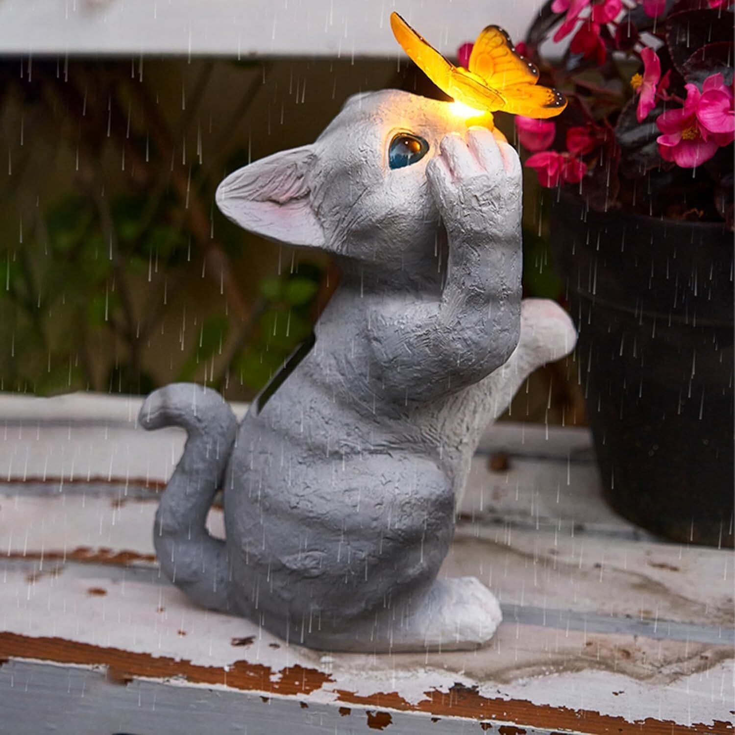 猫と蝶が描かれたかわいらしい置物LEDライト。太陽の光を取り込み、夜になると自動で点灯し、お庭やベランダを幻想的な空間に演出します。防水仕様なので、雨の日でも安心して使用できます。手軽なソーラーパネル式で、配線不要で設置も簡単です。屋外での使用に最適な素材を使用しており、長期間の耐久性も抜群です。おしゃれなガーデンライトとして、癒しのひとときを提供します。毎日の暮らしにほんの少しの幸せと楽しさをプラスしてくれる、特別なアイテムです。