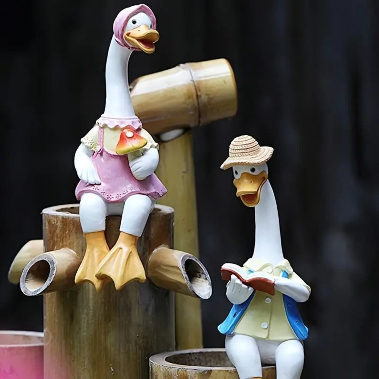愛らしいアヒルのカップルの置物が、あなたの庭を素敵に飾ります。