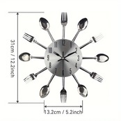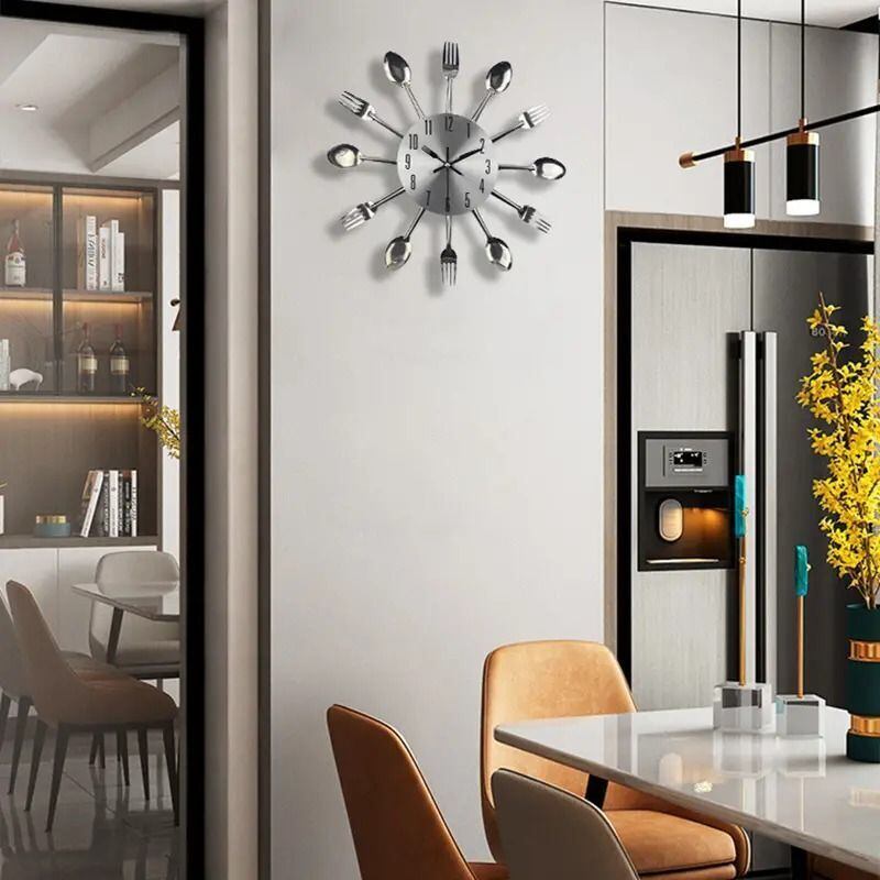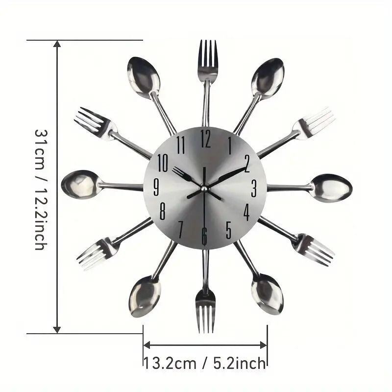 キッチンをさりげなく飾るアイテムとして生まれた、カトラリーデザインの壁時計。メタル製のナイフ、フォーク、スプーンがユニークなインテリアアクセントとなり、モダンでおしゃれな空間を演出します。時刻を確認するだけでなく、食事の時間を楽しみながら料理をするきっかけにもなること間違いなしです。 毎日の食卓がより楽しくなるように、あなたをおしゃれなキッチンタイムへと誘います。時を見るたびに笑顔で過ごせるような、クリエイティブなアイテムです。
