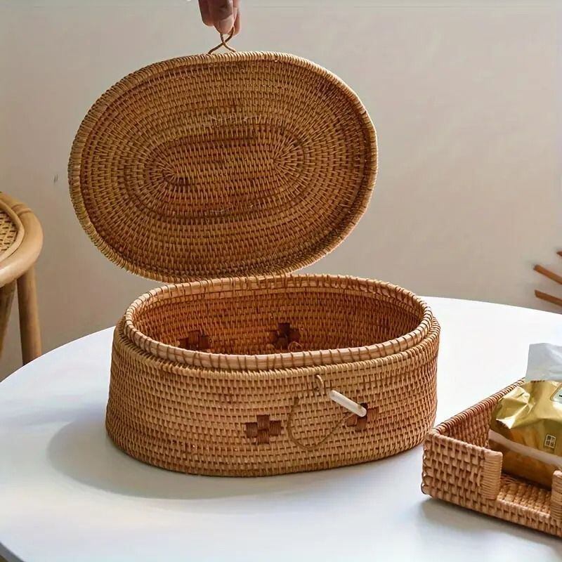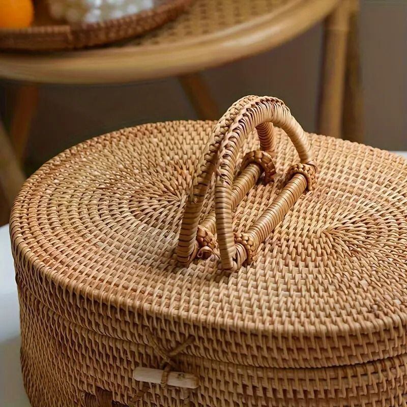 収納カゴ 収納バスケット お菓子入れ 蓋付き バスケット ラタン かご 収納 ボックス 持ち手付き おしゃれ かわいい 籐 リビングルーム キッチン インテリア 小物入れ モダン レトロ ヴィンテージ 雑貨 | mellland インテリア 雑貨
