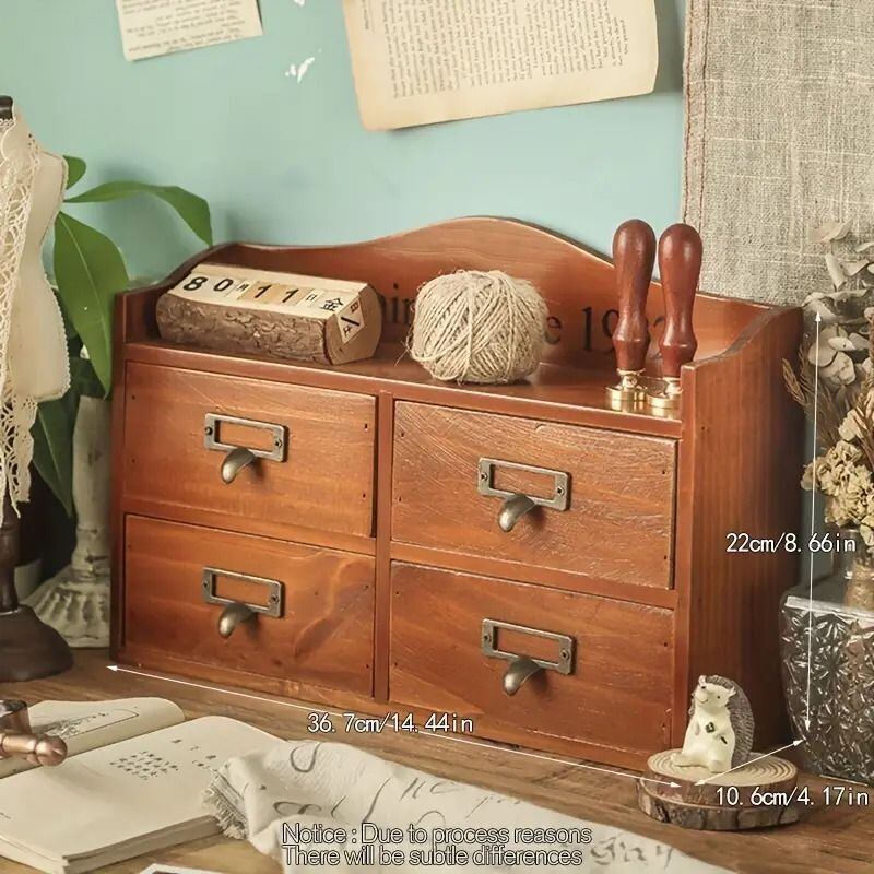 ミニチェストは、木製の引き出しが備わる卓上収納ボックスで、ヴィンテージ感とアンティーク調のデザインが特徴です。デスクの上やリビング、寝室に置いても違和感のないおしゃれなルックスは、使う場所を選ばず、周囲のインテリアと調和します。そのサイズ感はコンパクトながらも、必要な小物類をしっかり収納できる実用性を兼ね備えています。デスク周りの整理整頓を簡単にし、作業効率をアップさせるお手伝いをします。さらに、引き出しのデザインはクラシカルで、どこか懐かしい雰囲気を醸し出しており、見た目だけではなく触り心地や使い勝手にもこだわりました。
