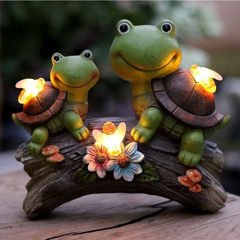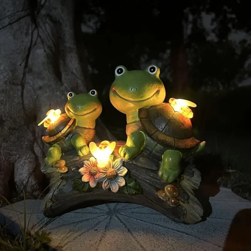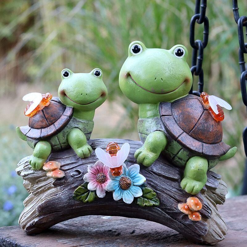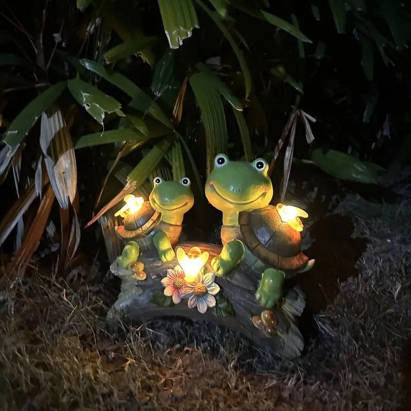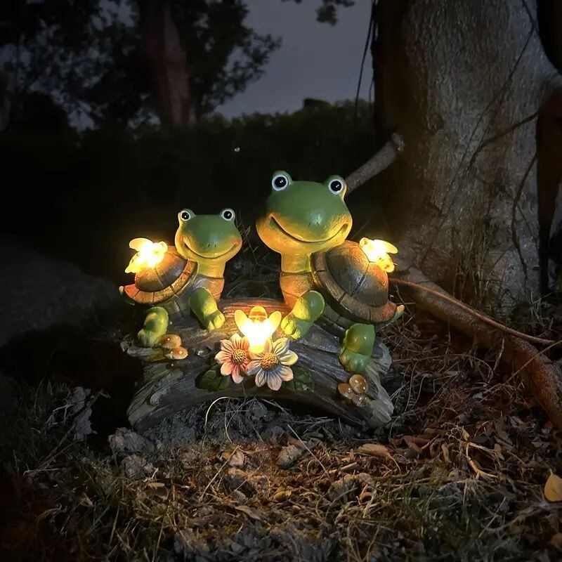 心癒される庭の風景を演出する、かわいい二匹のカメのソーラーオーナメント。お庭や玄関にぴったりの可愛らしいカメの置物は、LEDライトが内蔵されており、暗くなると自動で点灯します。日中に太陽光で充電され、夜になると柔らかな光を放ち、ほっこりとした雰囲気を作り出します。ガーデニングやインテリアとしても楽しめるこのオブジェは、どんなスペースにもマッチし、訪れた人々の心を温かくすること間違いなしです。自然を感じながら、おしゃれなガーデンライフを楽しみましょう。