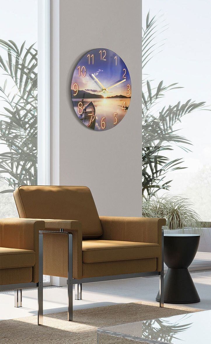 壁掛け時計 掛け時計 サイレント 静音 時計 クォーツ 電池式 ガラス ウォールクロック 丸型 壁掛け おしゃれ モダン クリエイティブ ヨーロピアンスタイル インテリア アート 湖 夕日 リビングルーム 寝室 直径30cm | mellland インテリア 雑貨