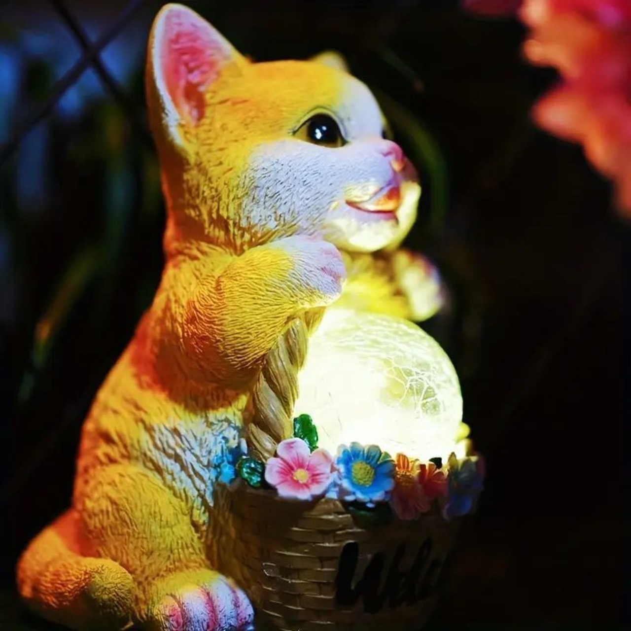 このアンティーク雑貨は、可愛い猫のデザインが特徴のソーラーライトです。日中は素敵な置物としてお庭やベランダを華やかに演出し、夜になると灯りがともります。イエローの優しい色合いが、自然の中に溶け込み、まるで猫が花のブーケを抱えるような遊び心あふれるデザイン。温かみのあるライトが、暗い夜をやさしく照らし出し、心地よい癒しの空間を作ります。バラエティ豊かなガーデンアイテムの中でも特に目を引く存在感を放ち、訪れる人々を楽しませます。