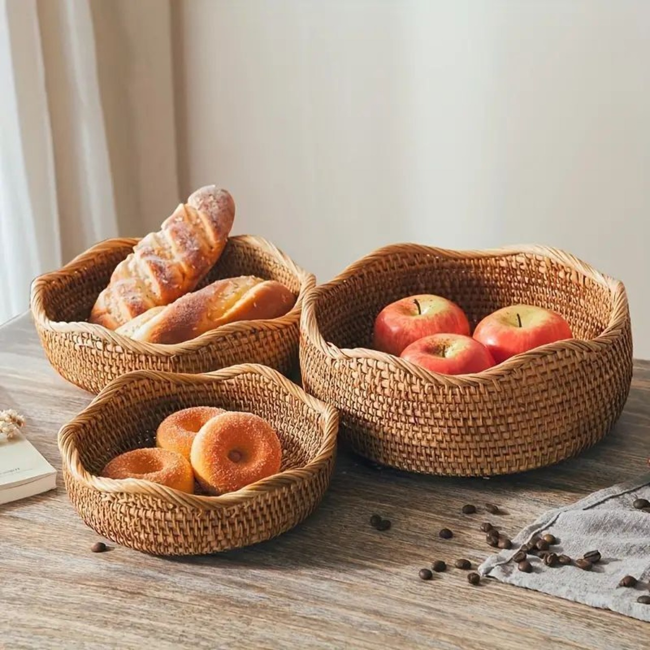 藤編み バスケット 3個セット S/M/L かご 籠 アジアン 雑貨 フルーツバスケット 卓上 トレー プレート 装飾 小物入れ おしゃれ ナチュラル 手編み ラタン 小物収納 コスメ 果物 フルーツ お菓子 収納 | mellland インテリア 雑貨