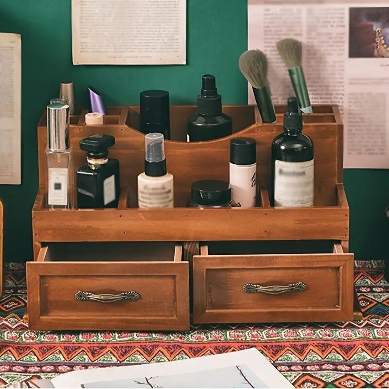 おしゃれで機能的な木製収納ボックスをお楽しみください。シンプルでありながらヴィンテージ感あふれるデザインが特徴的なこの収納ボックスは、卓上の小物をすっきりと整理整頓します。化粧品やコスメ、香水の収納に最適なサイズ感で、引き出しや仕切りがあり、文具などの小物整理にも大活躍。アンティーク調の風合いは、どんなお部屋にも馴染み、あなたのデスクをスタイリッシュに演出します。日常使いから特別な日まで、様々なシーンでご利用いただけるアイテムです。