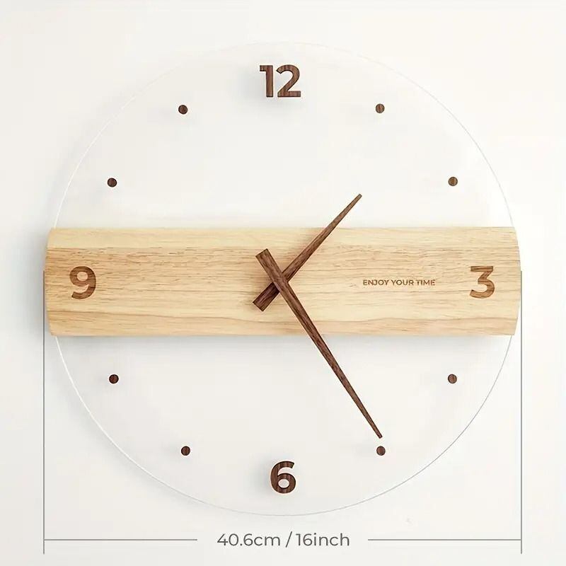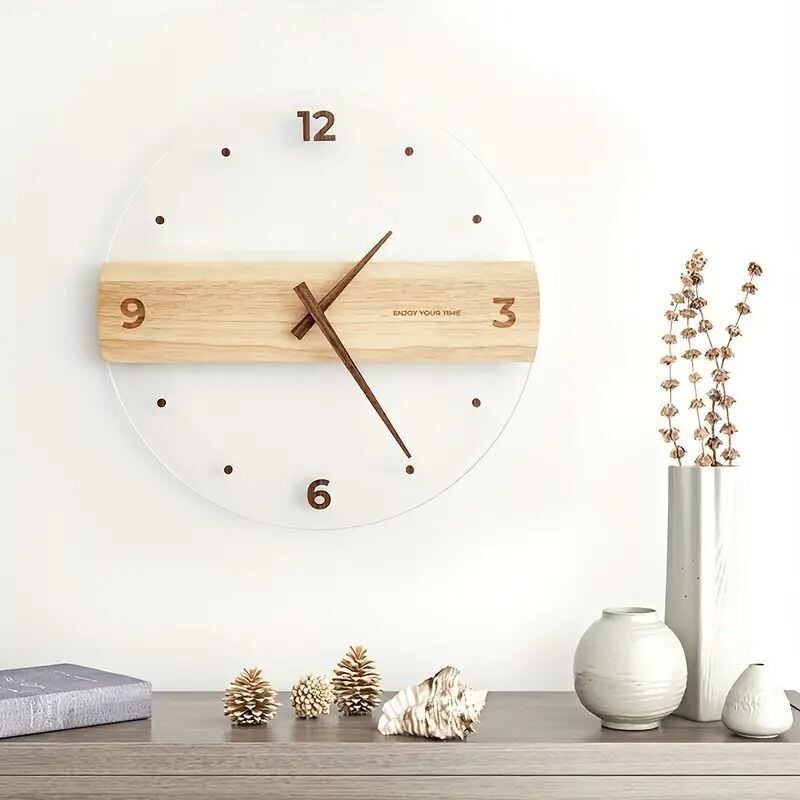 ナチュラルな雰囲気が魅力のウォールクロック。木目調の無垢材と透明なアクリルが組み合わさったミニマルデザインは、北欧インテリアやモダンナチュラルな空間にぴったりです。リビングやダイニング、キッチンなど、どんな場所にも自然と馴染み、優しい印象を与えます。シンプルで飽きのこないデザインなので、長く愛用できるのもポイントです。ギフトにも最適な、使いやすいデザインの壁掛け時計です。