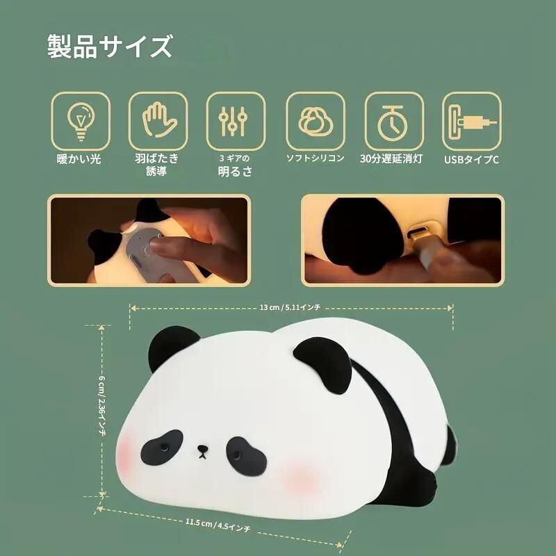 かわいらしいパンダデザインのライトで、心地よい癒しの空間を作り出しましょう!3段階のタッチコントロール機能を搭載しており、気分やシーンに応じた明るさに調整可能です。30分タイマー機能も備えているので、お子様のぐっすり眠る時間をサポートします。USB充電式で、どこでも手軽に使用できる点が魅力的です。シリコン製の柔らかい素材が安心感を与え、子供部屋や寝室、リビングといったさまざまな場所で活躍します。おしゃれで実用的なこのナイトライトは、大切な方へのギフトやプレゼントとしても最適です!ぜひあなたの空間に加えて、心安らぐひとときをお楽しみください。